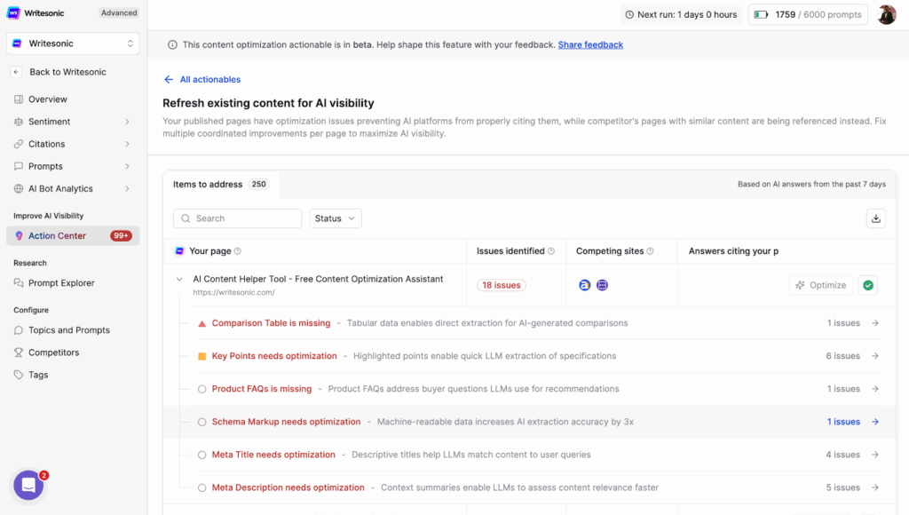 Content Optimization is our new Action Center feature that scans your indexed content and highlights exactly what’s preventing AI engines from citing it.