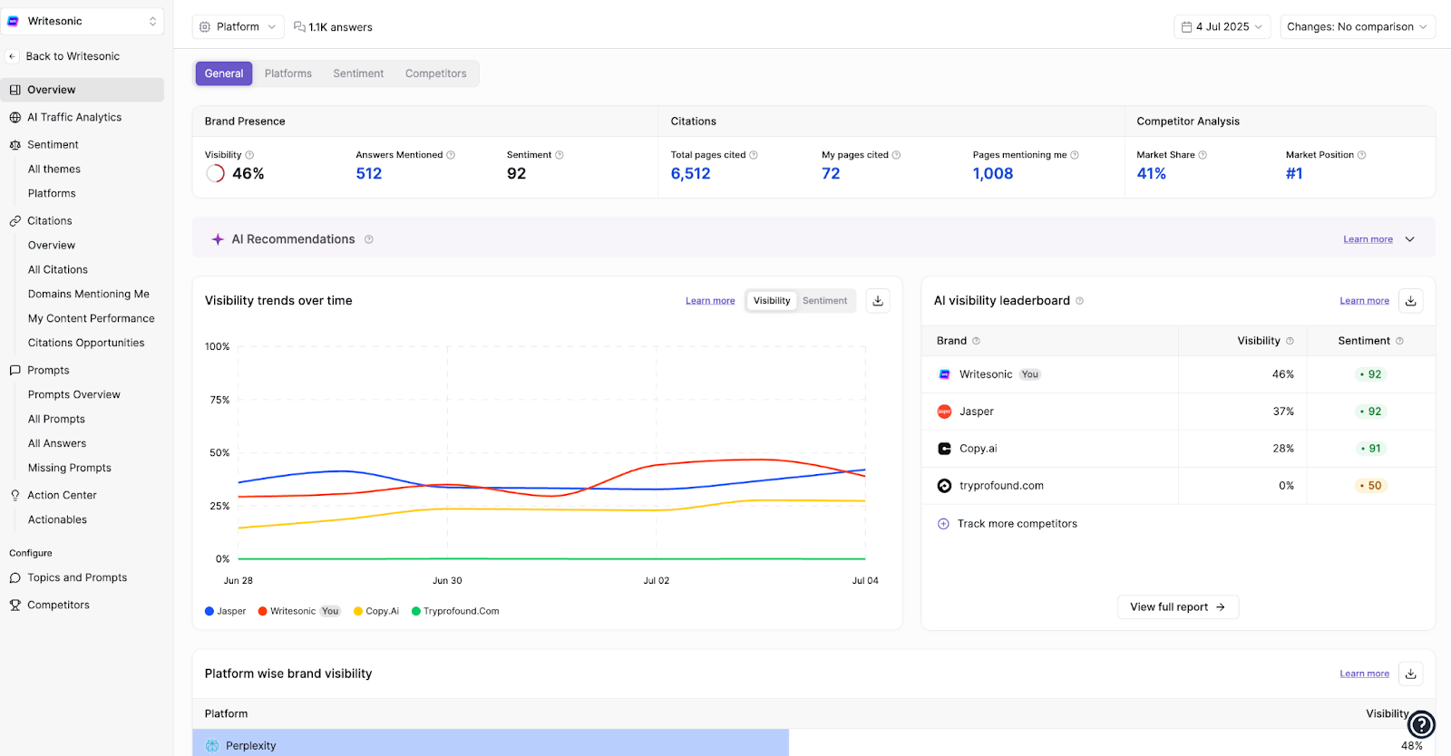 - Compare your AI search performance with industry competitors and monitor brand sentiment and overall visibility scores.